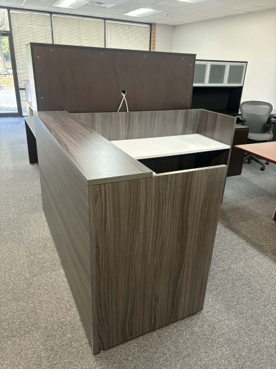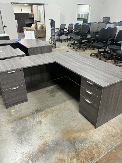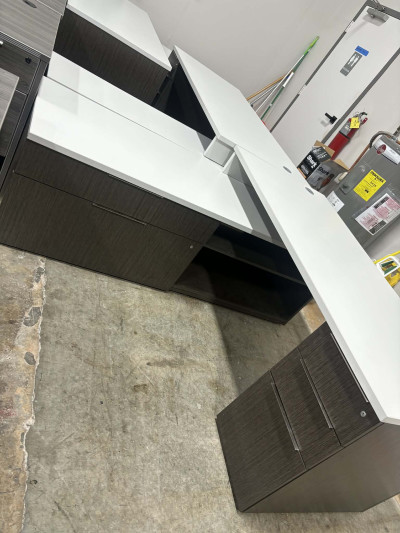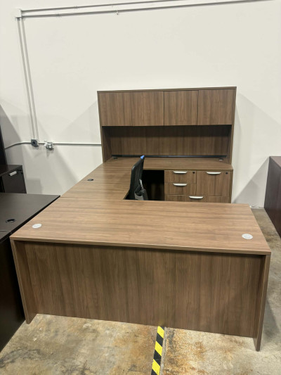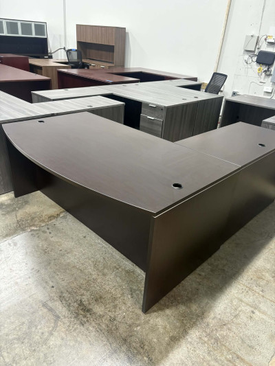 Espresso U shaped desk with 2 sets of deluxe drawers. Includes hutch with glass doors. Left Hand. $850