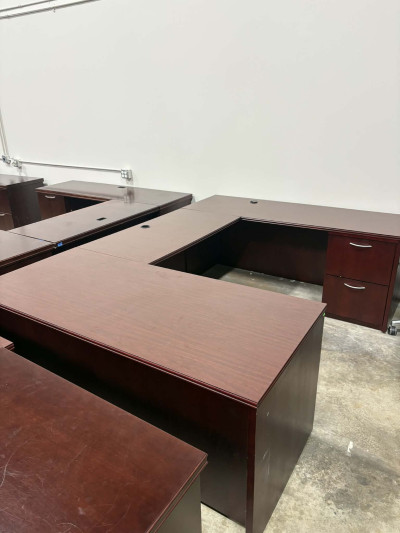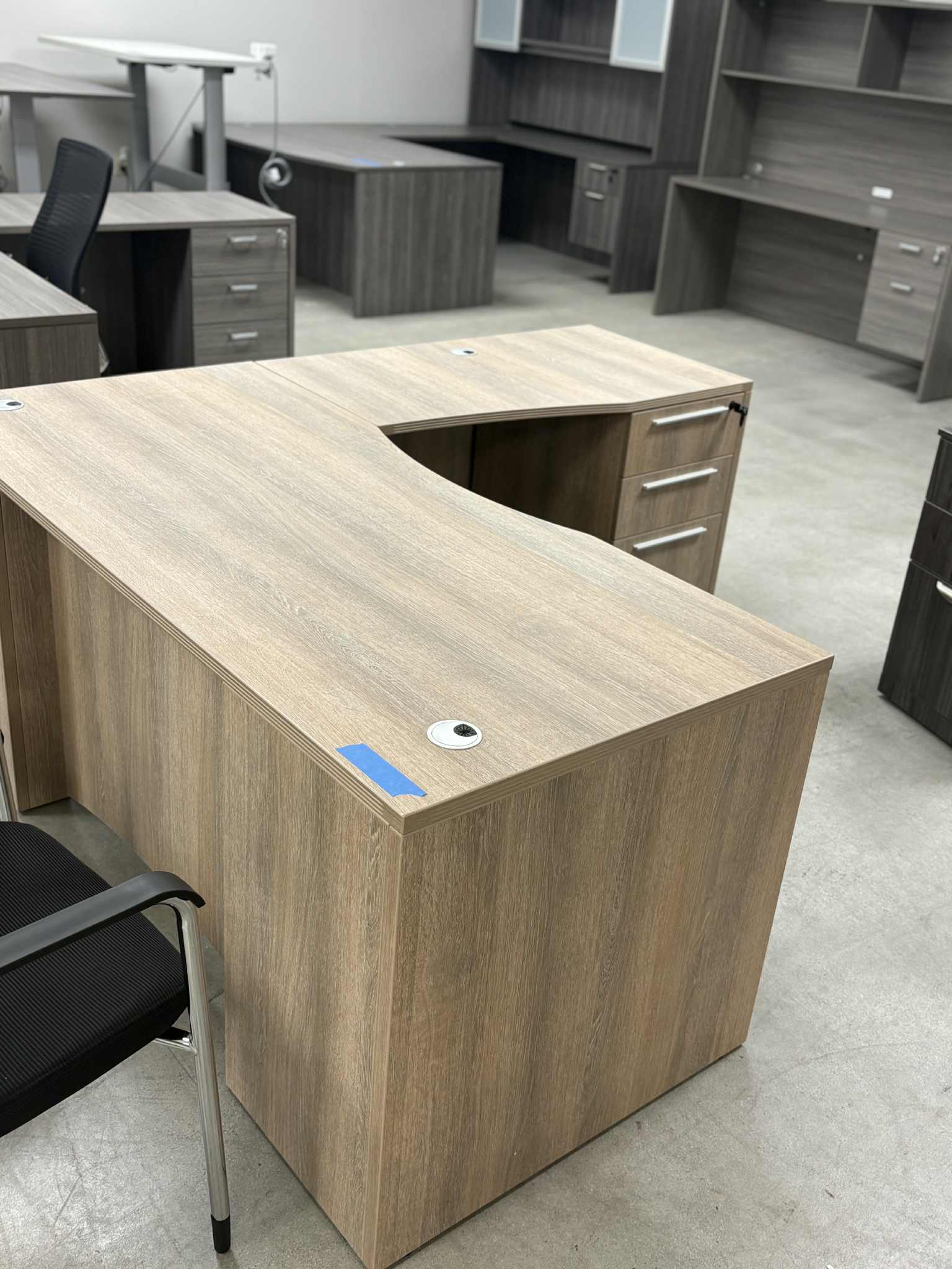 Ryker series Aged Oak color curved L shaped desk with step front modesty panel. $950. Available in this color and grey