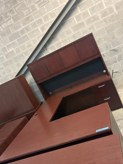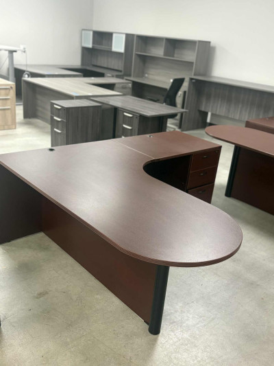 Ryker series Aged Oak color curved L shaped desk with step front modesty panel. $950. Available in this color and grey