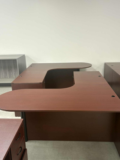 Pre owned Bullet Mahogany L shaped desk with deluxe drawers. 2 available. $550 each